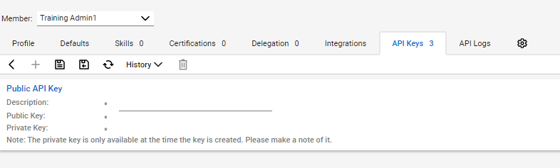 - Click on “API Keys” tab and press the “+” button. In the Description field enter a description, e.g. “3CX Connectwise CRM Integration” and save.